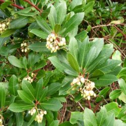 - Feuilles longues de près de 10 cm, riches en tanins, persistantes, alternes, aux bordures dentelées, d’un vert foncé terne en dessous et luisant au-dessus.