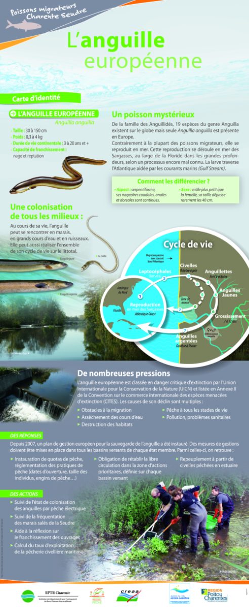 Créée en 2009 pour la sauvegarde et la restauration des poissons migrateurs (anguille, aloses, lamproies, salmonidés), la Cellule Migrateurs Charente Seudre a réalisé une exposition itinérante pour sensibiliser le grand public à la protection de ces poissons emblématiques.